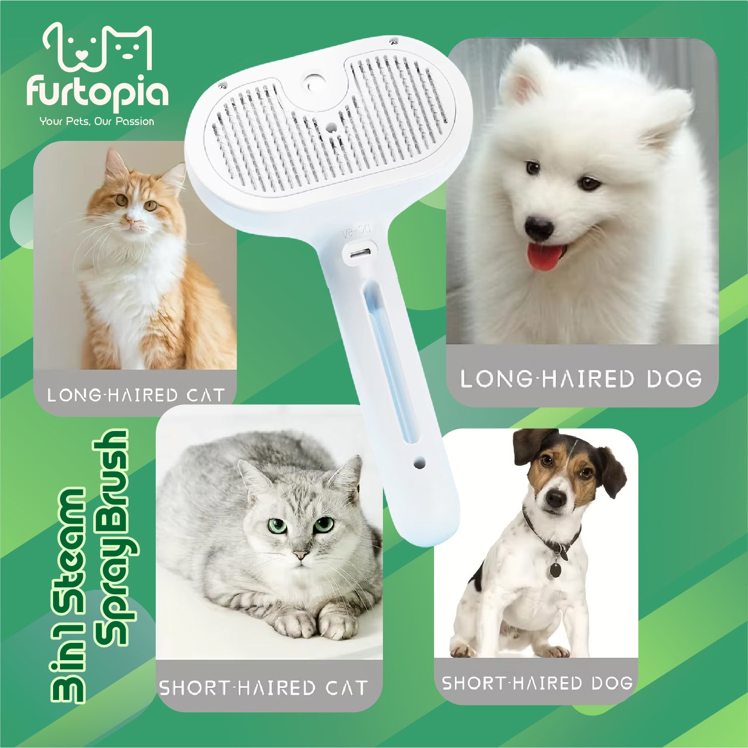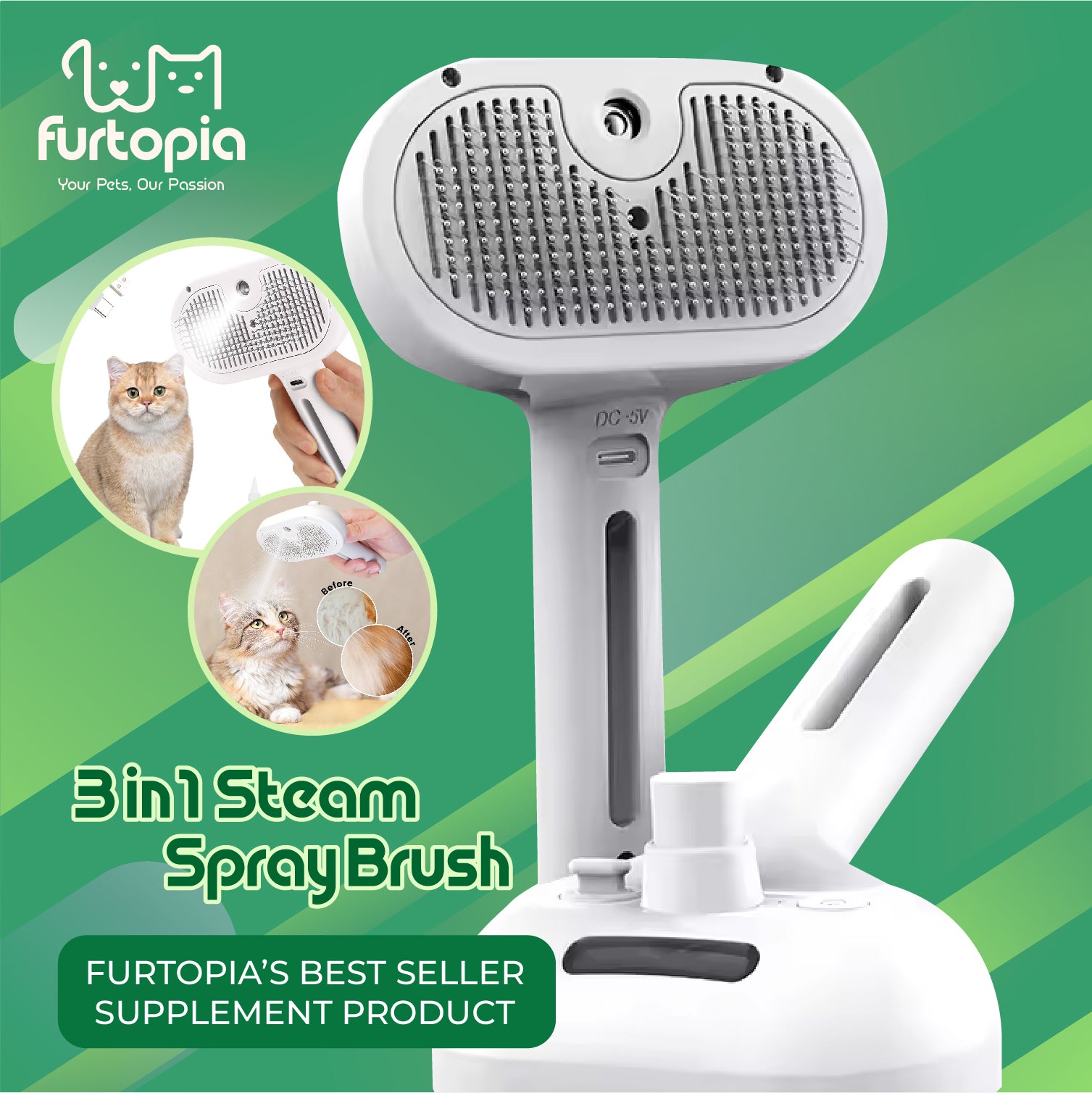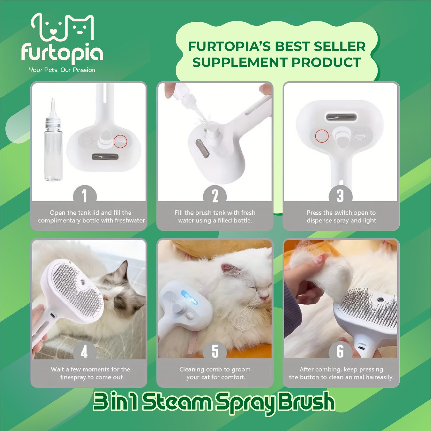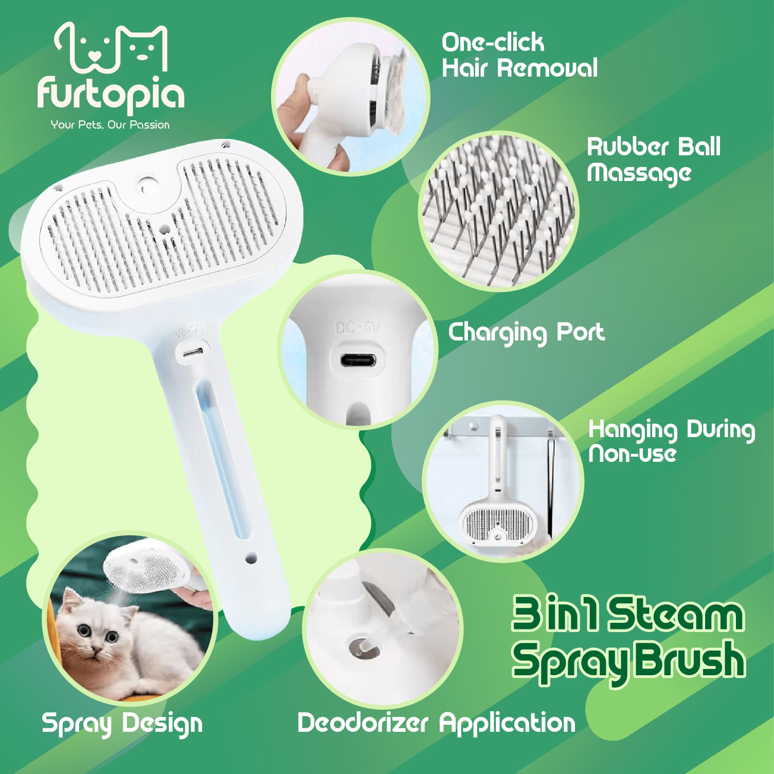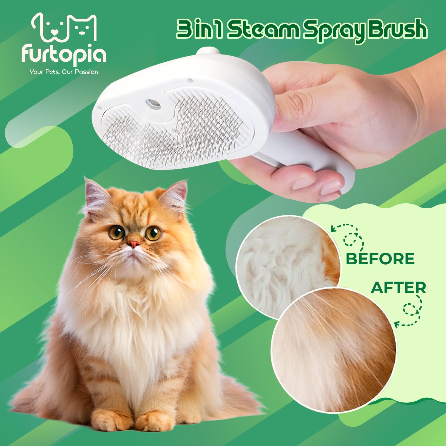 🍀 Ultimate grooming tool for both cats and dogs, no matter the fur type 🍀 Built-in misting feature lets you add water, softener, or deodorizer to reduce static and loose fur 🍀 Stainless steel bristles gently remove dirt, tangles, and shedding while giving a relaxing massage 🍀 One-touch button makes cleaning the brush quick and effortless 🍀 Keeps your pet looking fresh and feeling calm during every grooming session
